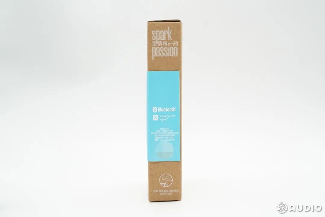 包装盒侧面信息,牛皮纸盒上印有233621的品牌口号“激情每一刻”,底部小字是“来自深圳国际低碳城的创新与设计”,凸显环保理念。侧面腰封介绍了耳机充电的相关信息,耳机充电10分钟可提供2小时续航,耳机+充电盒充电2小时共有18小时续航,耳机单次续航约6小时。