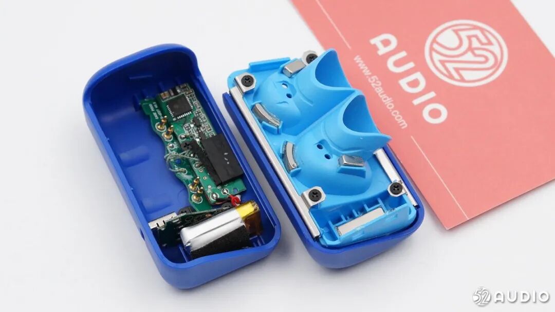 充电座舱壳体内侧展示,两侧的滑轨使用螺丝固定。盒盖开启处有一尺寸较大的条形磁铁,确保盒盖关闭时的吸力;左右耳机位置各有两颗磁吸用于吸附固定耳机。