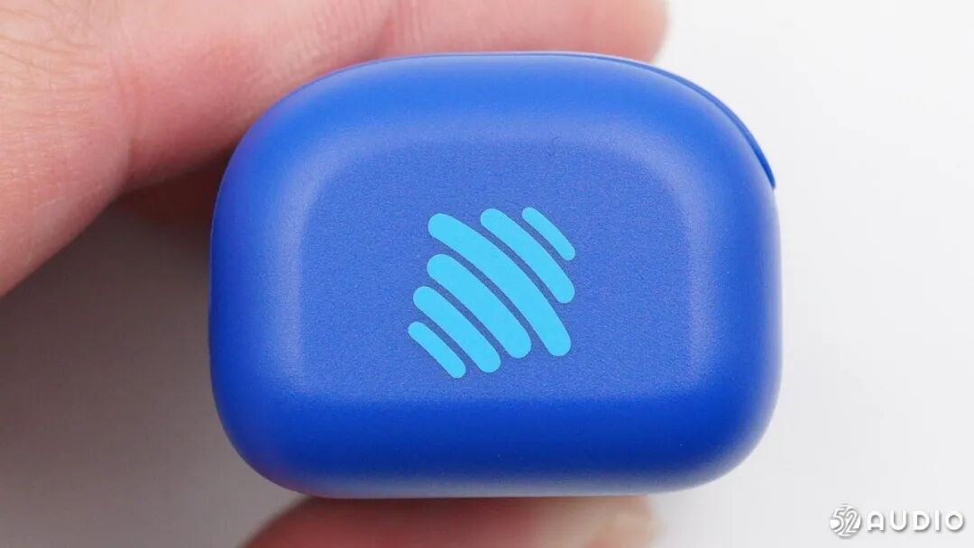 充电盒为侧滑设计,盒盖上有一个凹陷区域,便于手指发力,打开充电盒。盒盖左侧有“233621”的品牌Logo。
