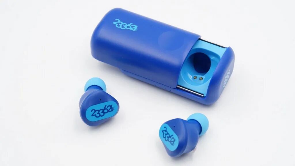 233621 Droplet真无线蓝牙耳机 加勒比蓝色 版本。耳机机身和充电盒机身均由两种蓝色搭配,看起来比较有层次感和运动感。