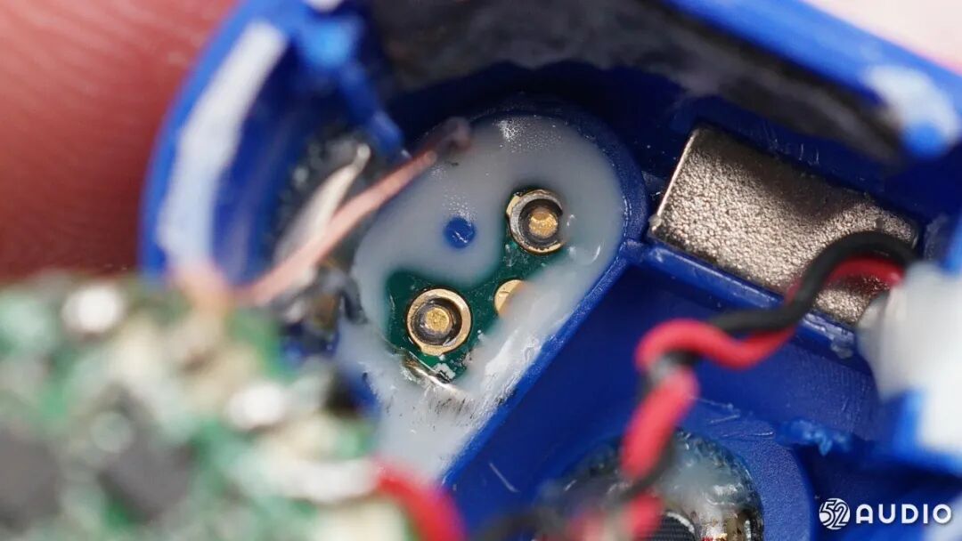 沿合模线拆开耳机,使用胶水密封。壳体上具备透气孔,可以将胶水挥发的气体排出去,从而不会影响音质。