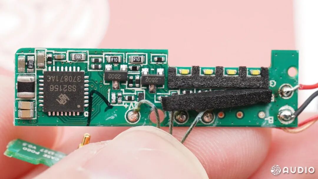 四颗LED电量指示灯特写,用泡棉间隔避免漏光。