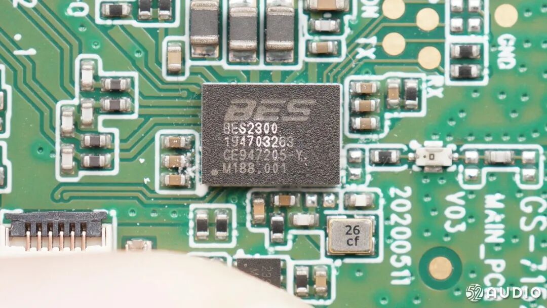 主板上,主控芯片采用恒玄 BES2300 蓝牙音频SOC,蓝牙5.0,支持高性能的自适应主动降噪技术,可以让主动降噪耳机使用一颗全集成芯片实现高音质和主动降噪;微源半导体 LP28300A电池电源管理芯片为内置电池充电;以及永富康CS5801T过压过流保护IC进行输入过压保护等。目前市面上恒玄BES2300蓝牙芯片平台仅有少量几家大厂做出可量产主动降噪耳机产品, 由此可见233621品牌在降噪领域有不俗的功底。