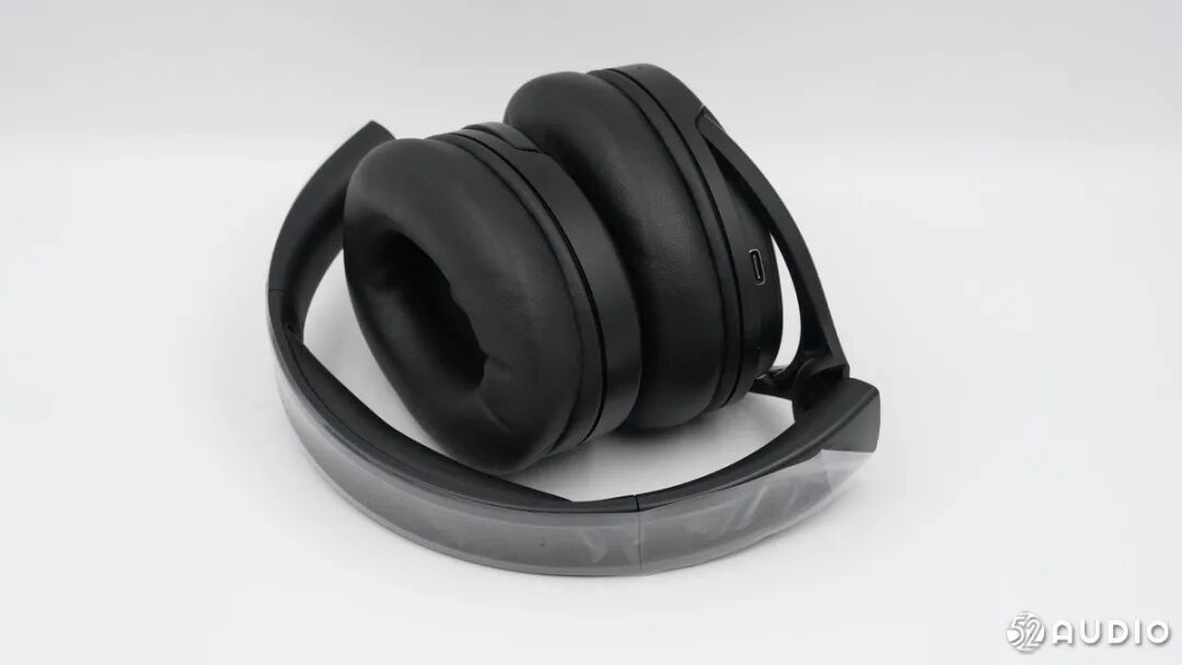 耳机铰链结构特写,可实现向内折叠和左右旋转。