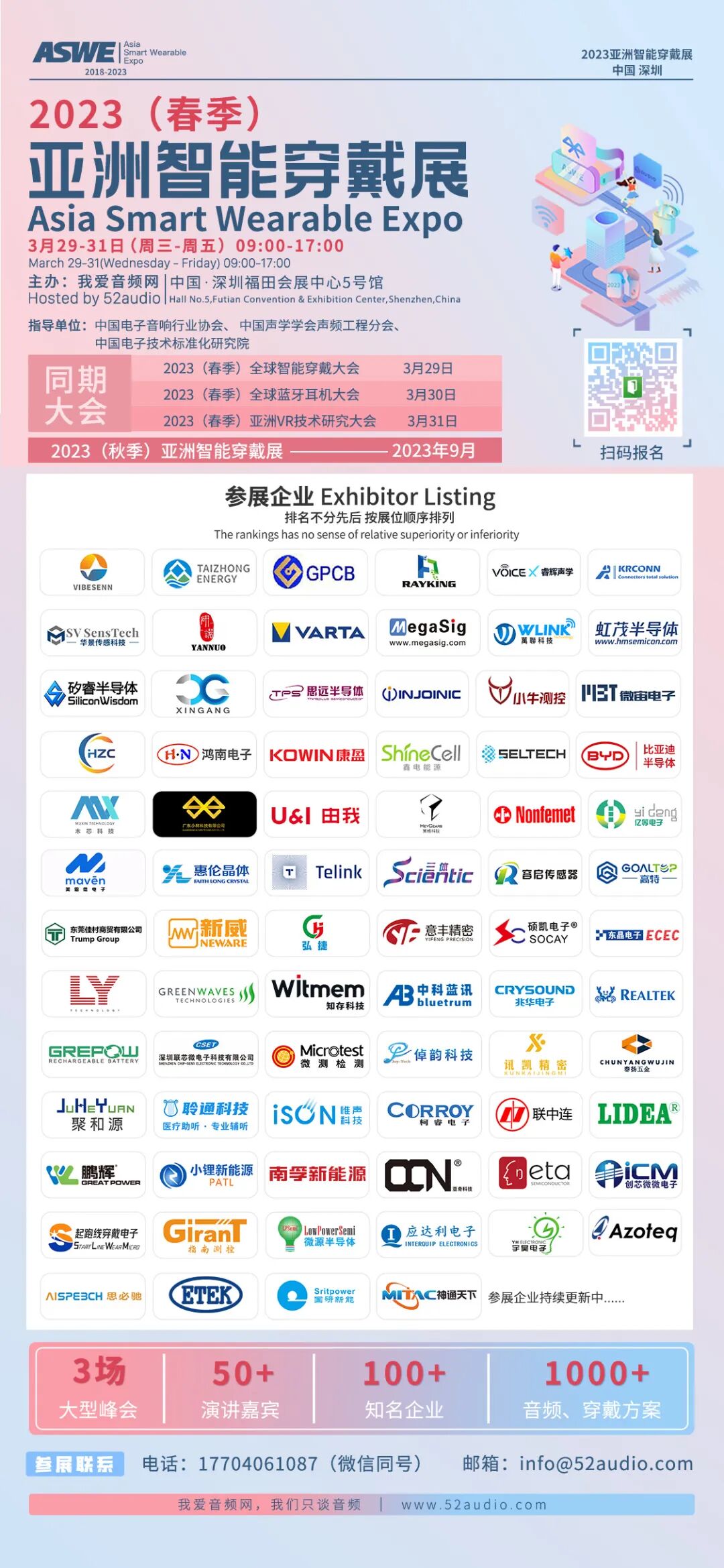 2023(春季)亚洲智能穿戴展将于2023年3月29日-31日盛大开幕,多家参展企业已经各就各位,更有50+行业大咖登台分享最新的行业动态,分析行业发展态势。
