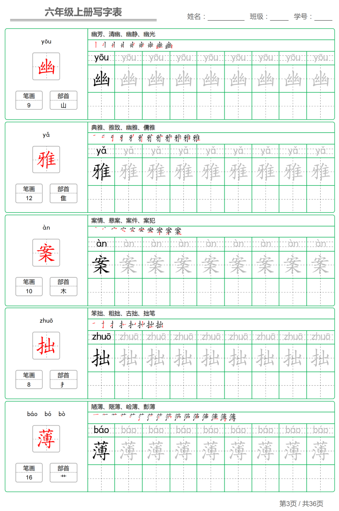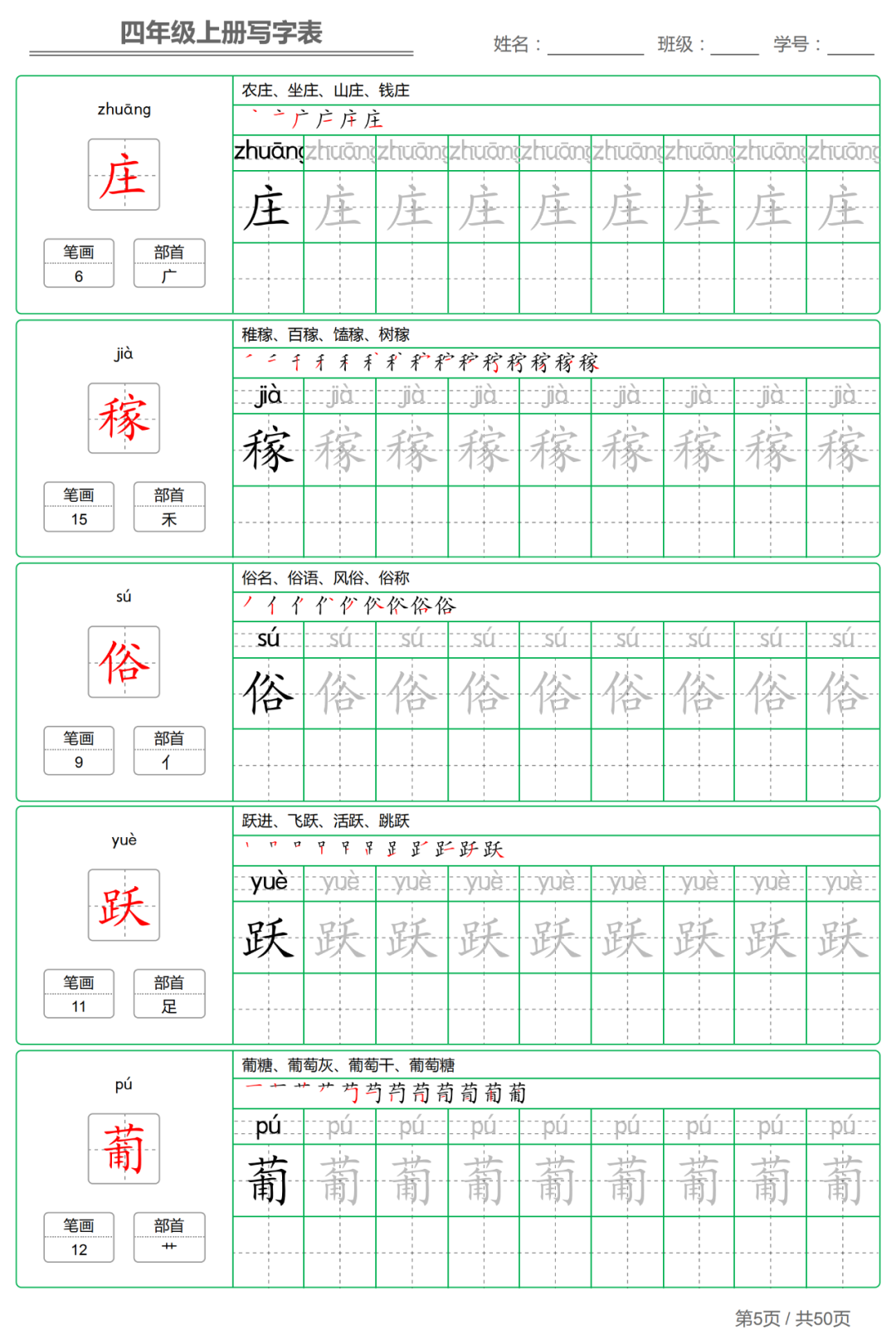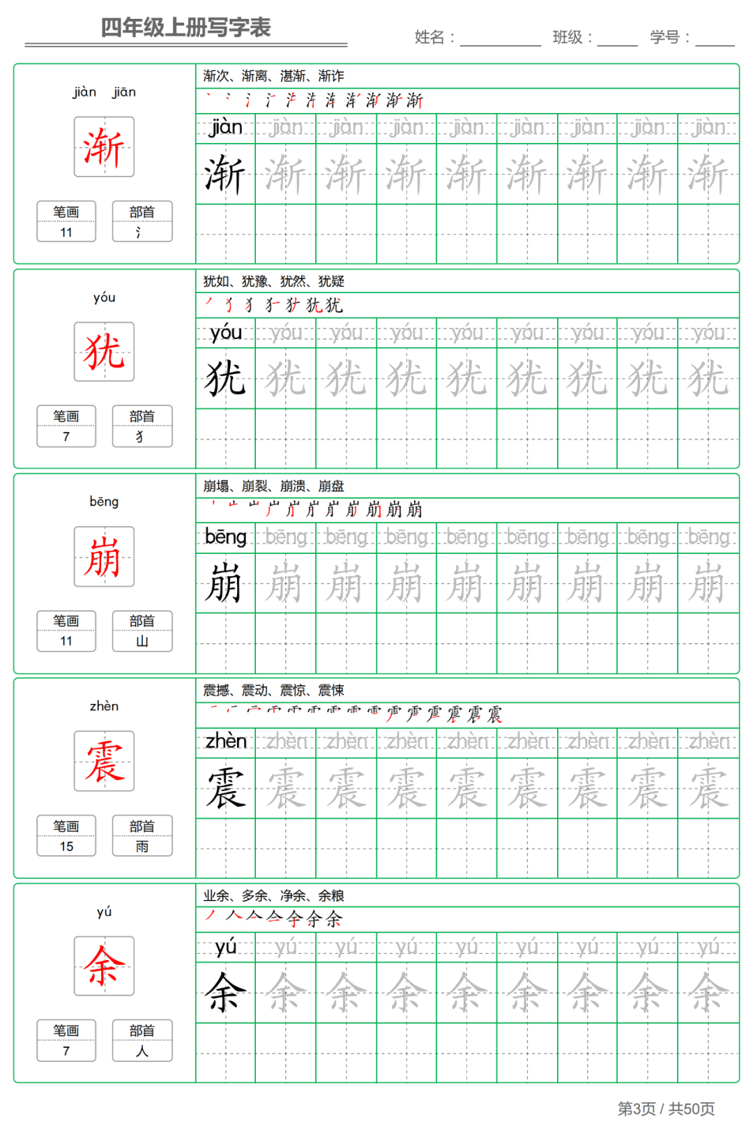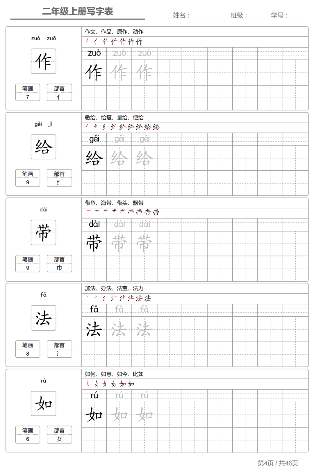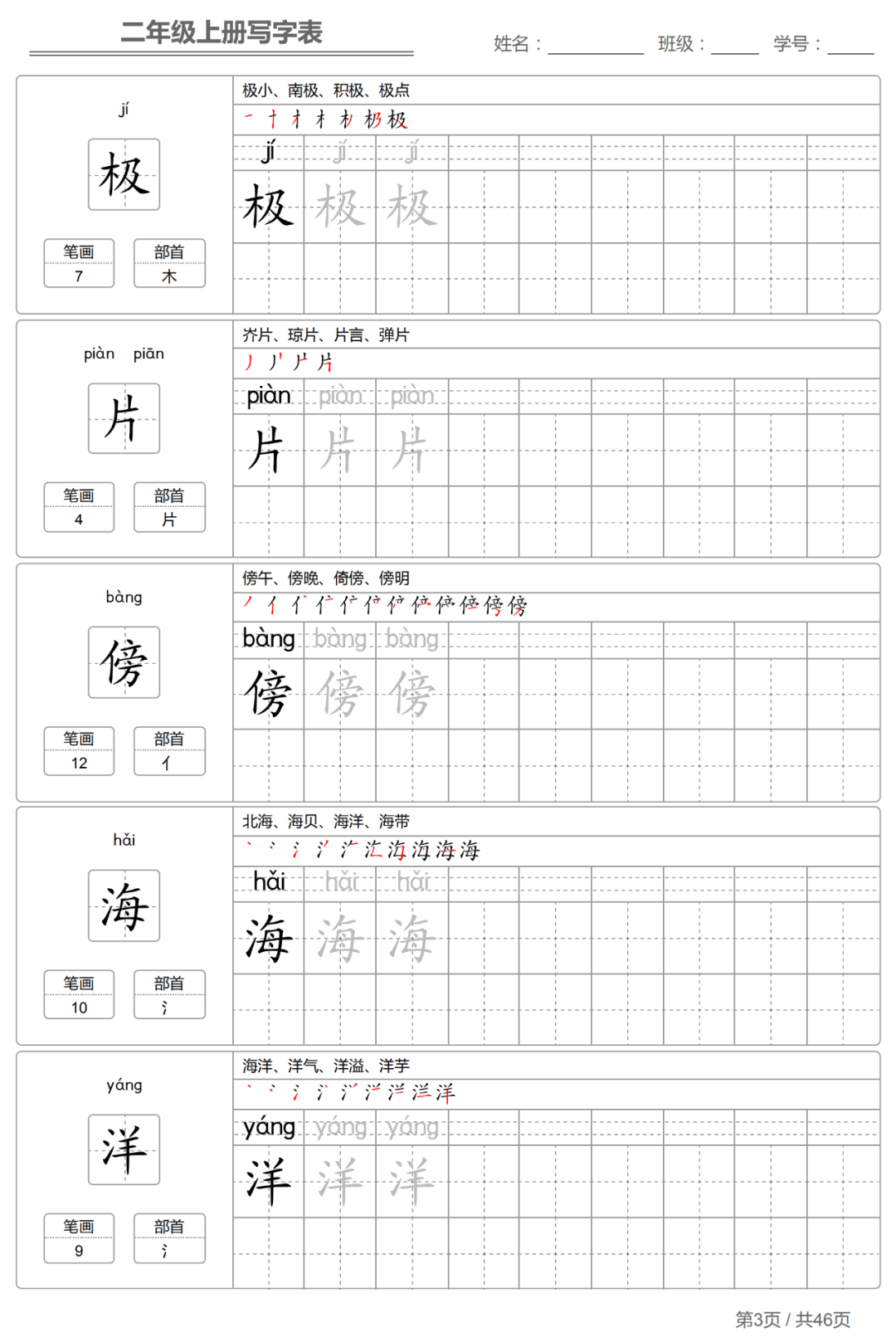 以下各年级仅展示部分字帖