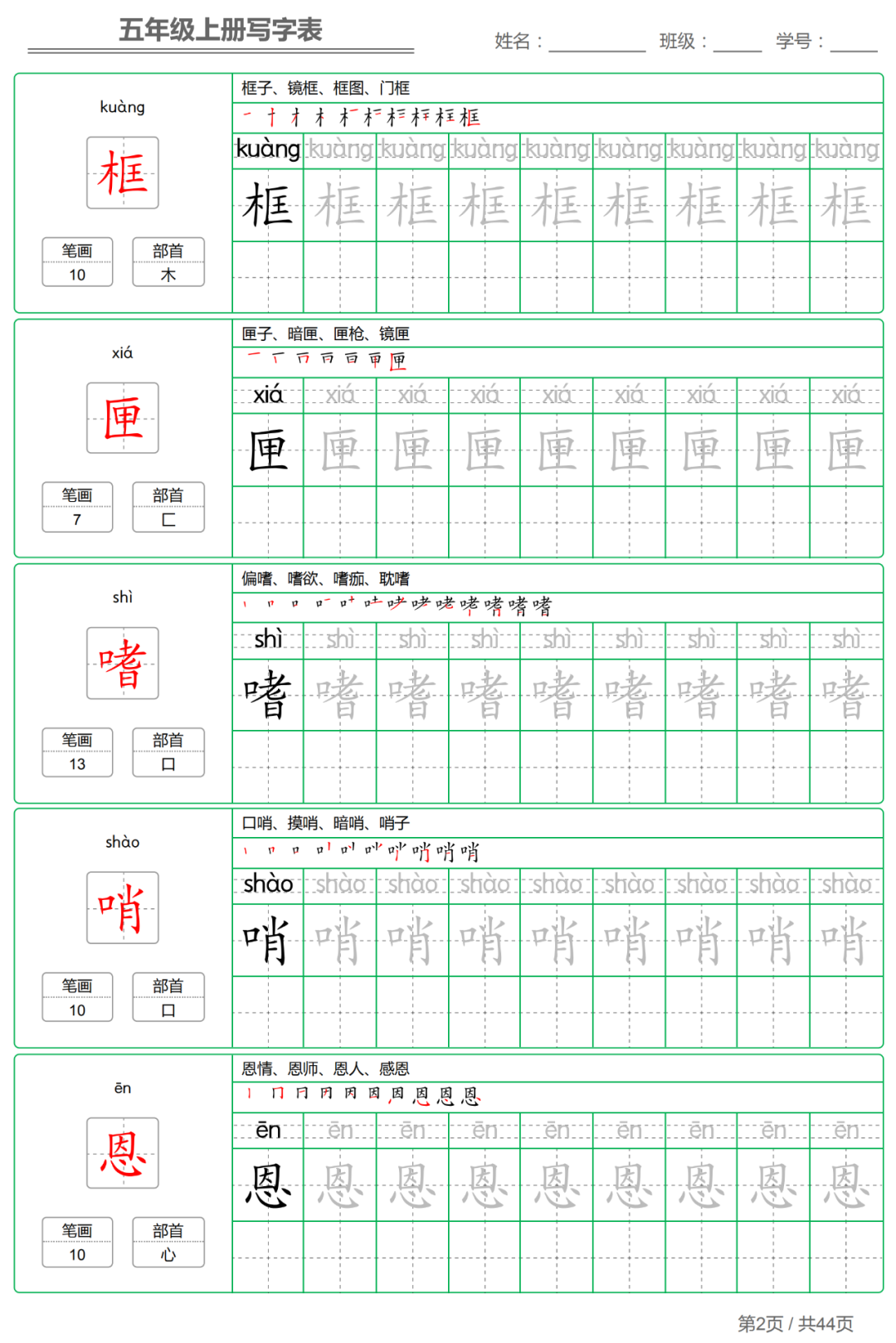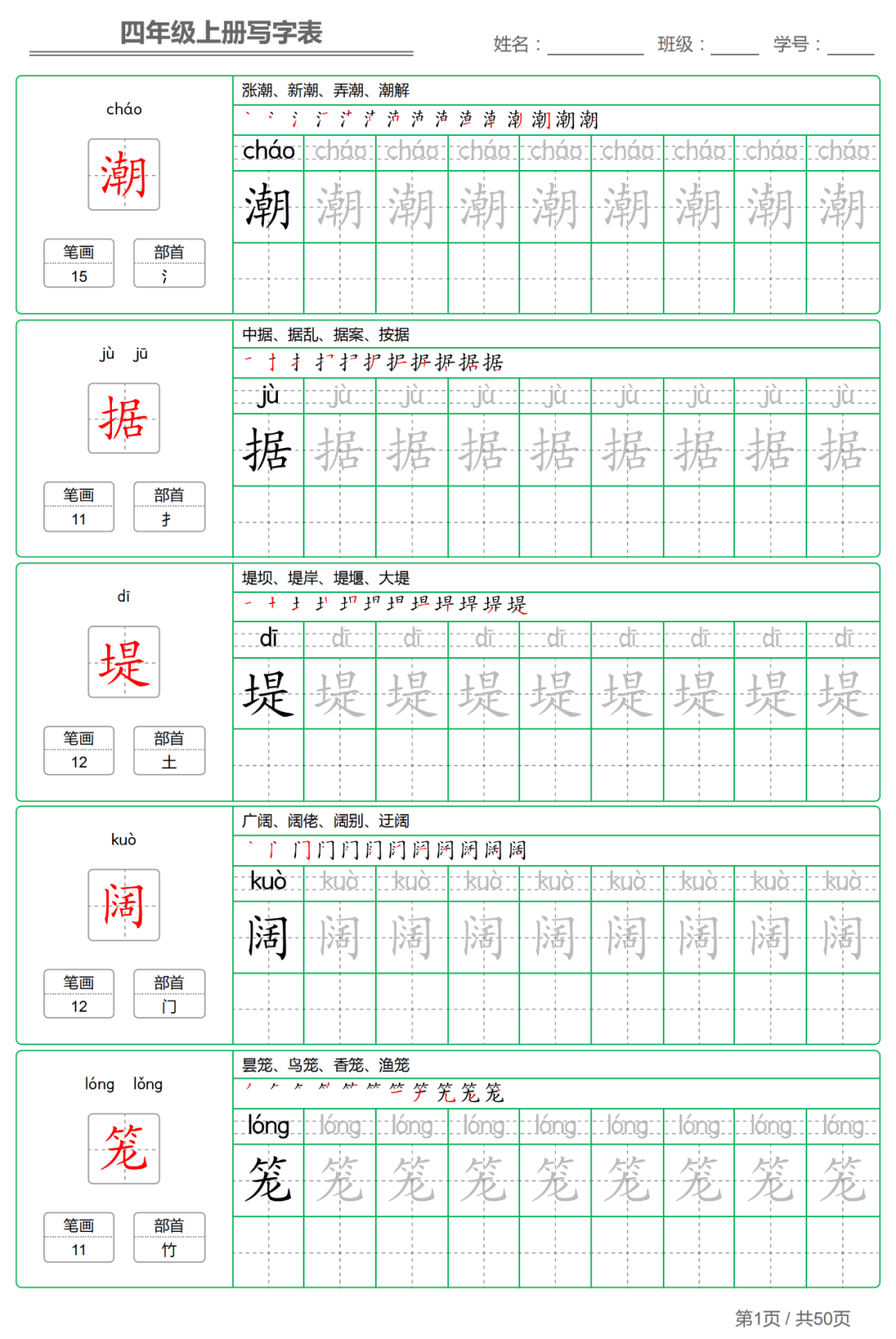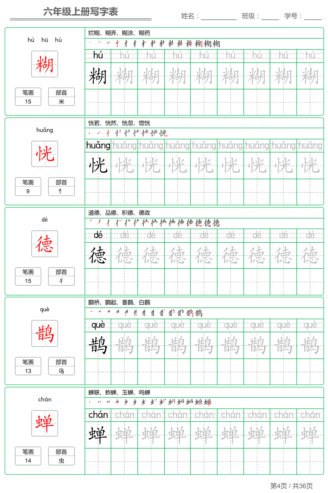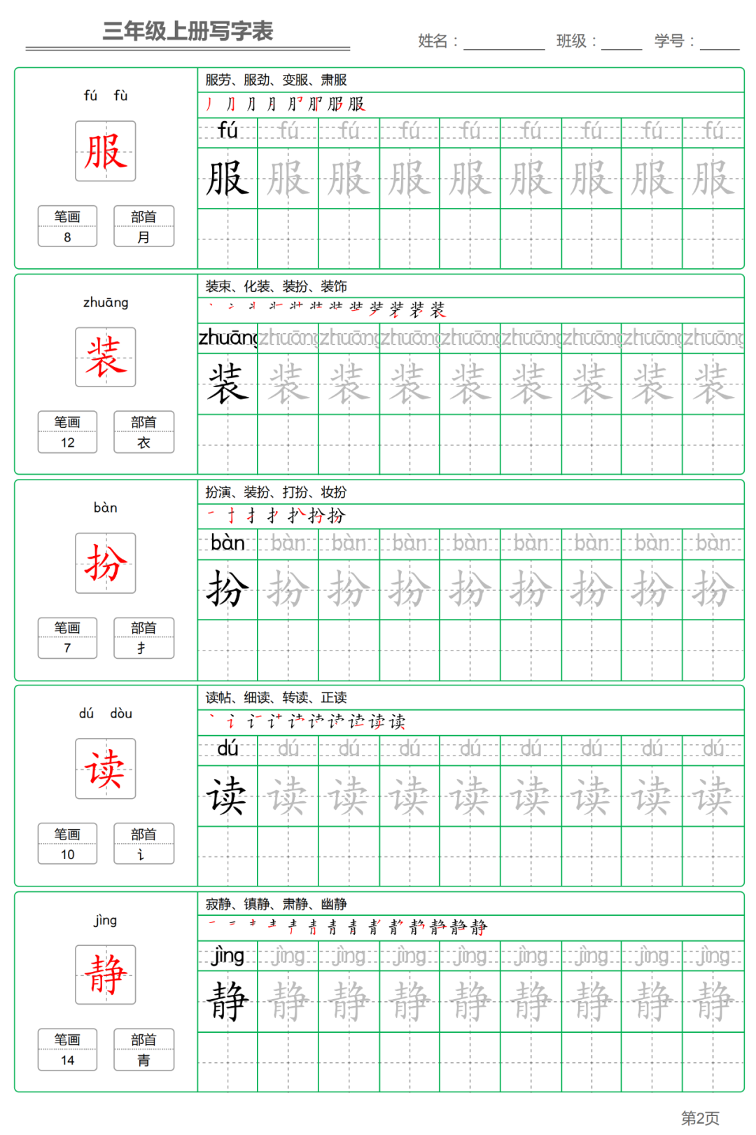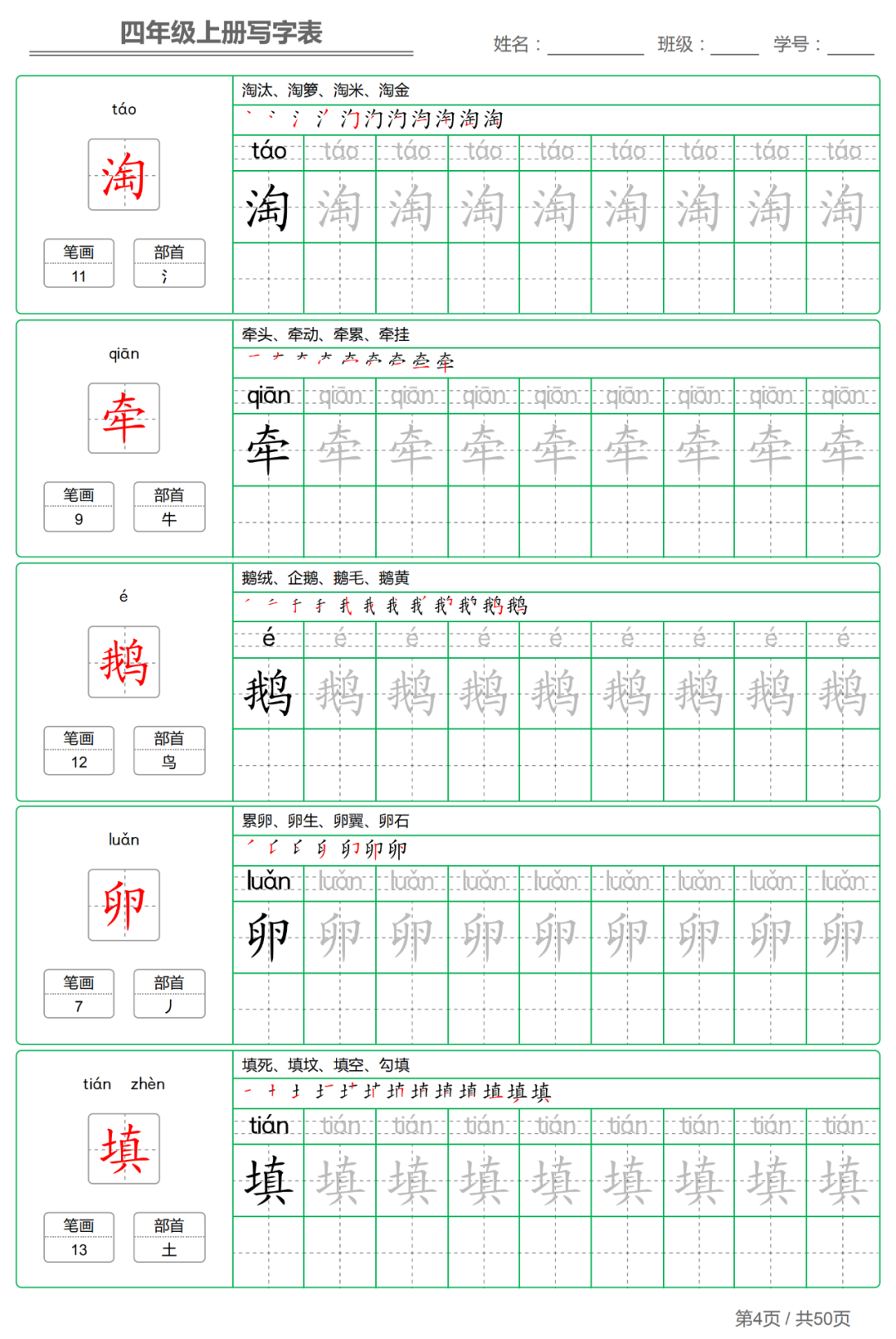 以下各年级仅展示部分字帖