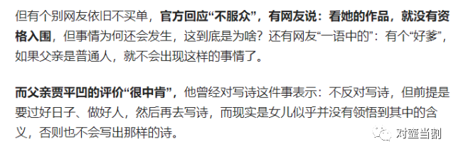 当然也有理智的网友称,贾浅浅所写的这些诗歌,完全是把诗生活化了,写的太过随意低俗,这样的“才女”为何能拥有这么高的地位?难道就因为有一个出名的父亲?