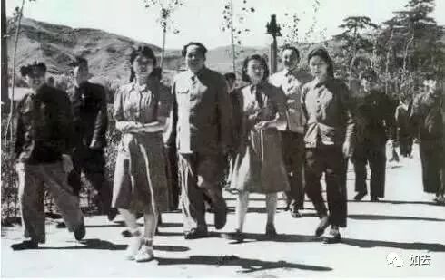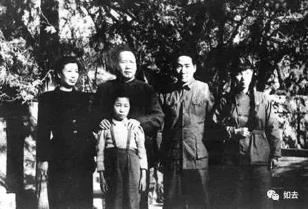 1949年,毛泽东与江青(左1)和长子毛岸英(右2)、儿媳刘松林(右1)、女儿李讷在北平香山。