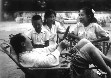1952年8月9日毛泽东同李敏、李讷、毛远新在香山听李讷讲故事。那时,李敏、李讷和毛泽民的儿子毛远新还在上小学。