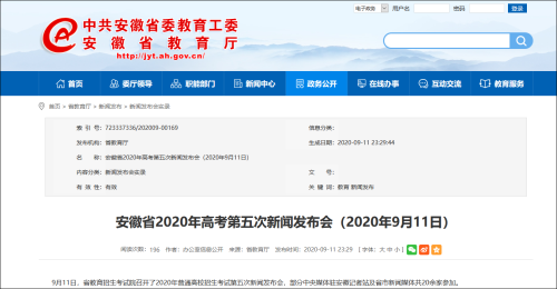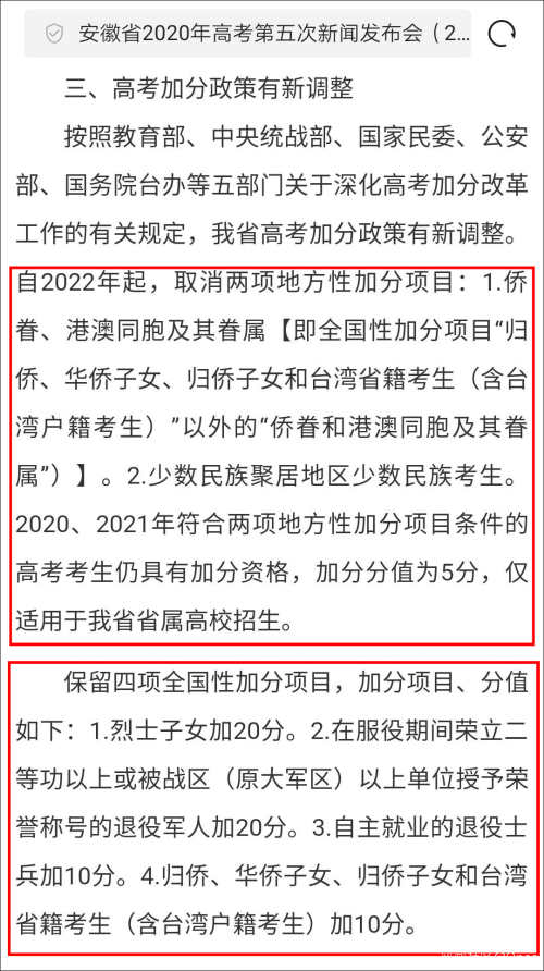 据安徽省教育厅官网9月11日消息,安徽省教育招生考试院发布高考招生新政,自2022年起,安徽省的高考加分政策将开始进行调整:取消侨眷、港澳同胞及其眷属和少数民族聚居地区少数民族考生的加分;但烈士子女加分从原先的10分调升至20分。
