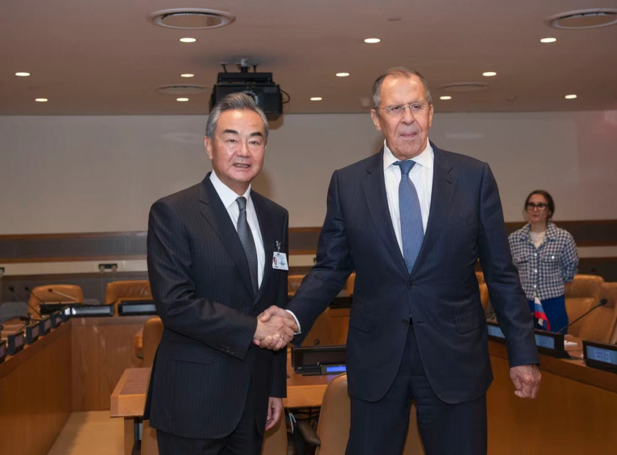 当地时间9月21日,国务委员兼外长王毅在纽约出席联合国大会期间会见俄罗斯外长拉夫罗夫,图自外交部网站