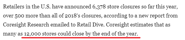 迄今为止,整个零售行业已经宣布关闭近8600家门店,高于2018年关闭的约5900家。预计今年全年关闭门店将多达12000间。