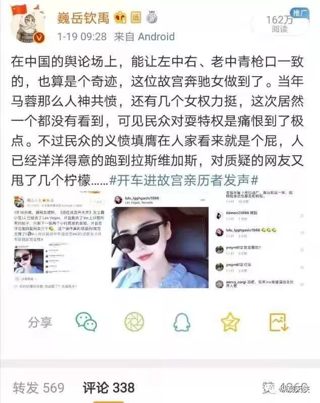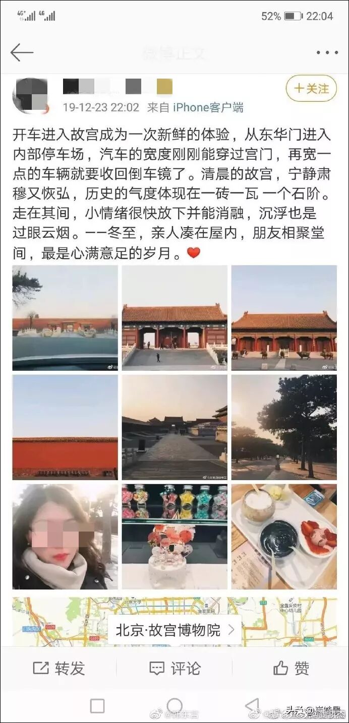 比如,一位女网友被曝出于18年11月“第一次开车进故宫,在车上很兴奋”。