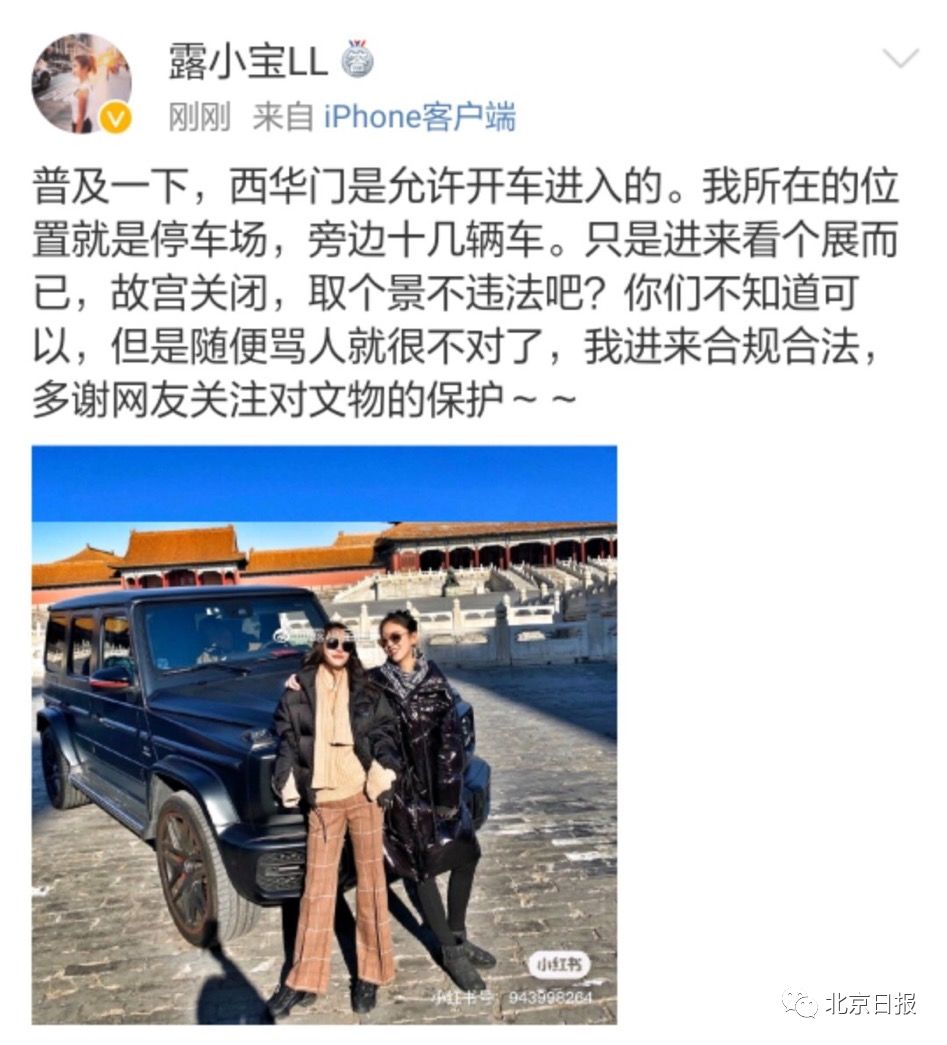 @露小宝LL事件传开后,曾有故宫工作人员透露,游客是不允许开车进入故宫的,而出于工作、观展等原因,一些人经过审批后可以开车进入西华门。