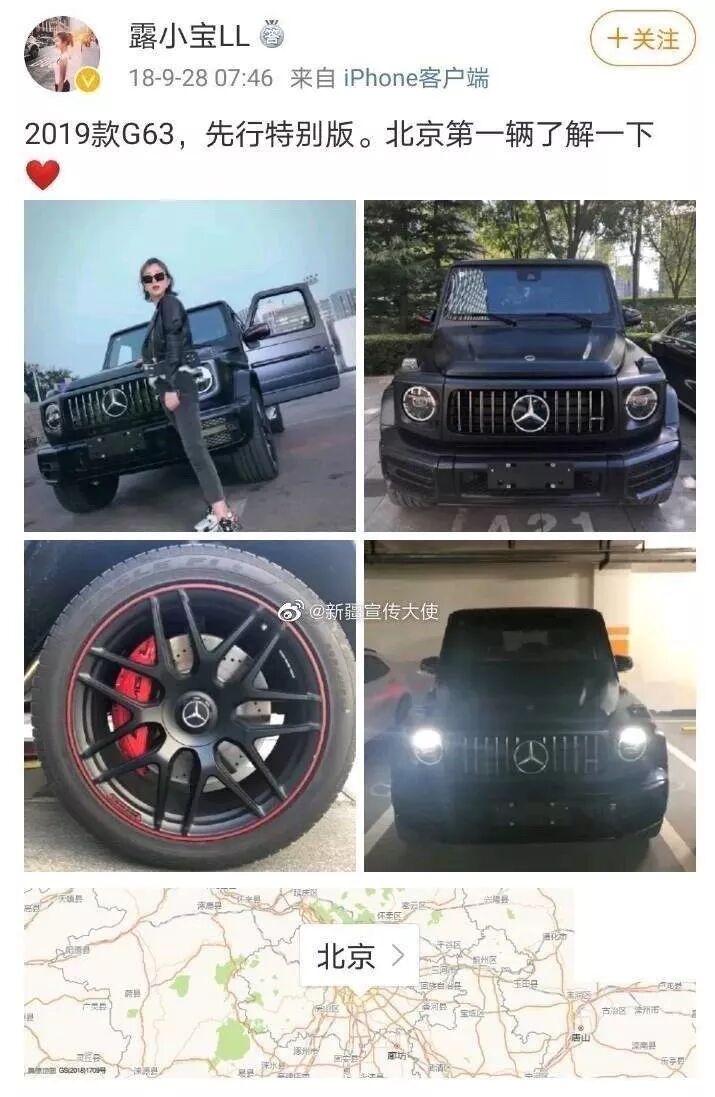 这辆车,奔驰G63先型特别版,指导价:244.88万,据称供不应求,还要加价等待,我想,这也是露小宝迫不及待炫耀的原因。