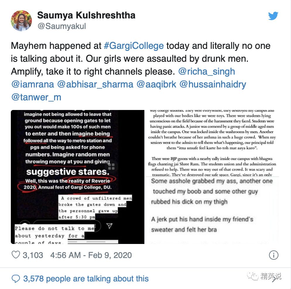 该事件发生在为期3天的大学节“ Reverie”期间,就在全校师生准备观看表演的时候,“千余名”印度男性翻越了大学围墙,闯入校内,肆无忌惮地对学校内的女性进行性侵和性骚扰。