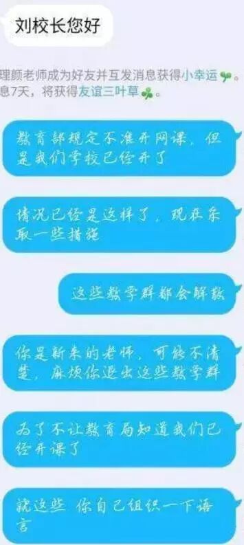第三,语言简洁,加微信,拉出教育部教育局的大旗,到最后的解散教学群,全程没有一句废话,而且校长语气十足。