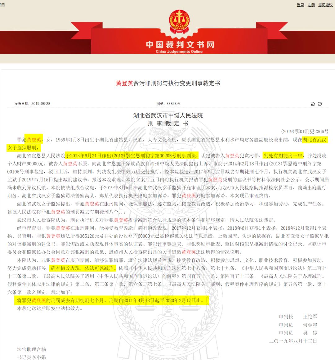 而神通广大的网友已经找到了线索。在裁判文书网上,正好有一则《黄登英贪污罪刑罚与执行变更刑事裁定书》,而当事人黄登英的身份,已经得到了当事人女儿覃女士的证实和确认。1、黄登英1959年出生,2011年被查,意味着在2010年之前就给孩子在北京买了新怡家园的房子。2、黄登英是大专学历,但是高考是在1977年恢复的,第一年有570万考生参加考试。所以黄登英大概率是在1978年考上了大专(因为1977年能考上的都是天赋极好的学霸),大专3年,所以1981年毕业,那一年她22岁。在当时的社会风气下,女生工作两年左右就会找人成家过日子了。按照24岁结婚,25岁生育估算,她的孩子大约生于1983、1984年,请记住这两个数字。3、新怡家园一期在2004年开盘,房价为8000/平,二期在2006年开盘,房价为1.2W/平。现在的房价为12万/平。如果黄登英的女儿生于1984年,那么2006年正好是22岁,大学刚刚毕业,家里就有条件给孩子买房,不得不羡慕。4、新怡家园是大房型,基本是一室一厅88平,两室一厅130平,三室一厅163平。考虑到黄登英的家人把她从疫区接过来,肯定具备隔离条件,至少两室一厅,也就是说黄登英买的房子,至少是两室一厅130平;当时的房屋总价应该是156万,利率5%,那就算首付30%,也要掏出46.8万首付,109.2万贷款,按照5%利率,30年计算,每个月要还款5838元。5、在2006年,应届本科毕业生的薪资大约为4000元/月;而根据恩施州统计年鉴-2006年记载,国有事业单位的年平均工资为14088元,约为1200元/月。以黄登英和其丈夫(假定也在事业单位)、女儿的全部月收入计算,扣税之后都还不起月供。那么,这笔钱是哪里来的呢?当然是贪污的来的。6、按照《(2013)鄂恩施中刑终字第00105号》提供的信息,宣恩水利水产局副局长易益富、出纳黄登英、会计夏龙艳身为国家工作人员,利用职务上的便利,大肆侵吞国家财产,易益富共计贪污公款481893元,个人分得217791元;黄某英共计贪污公款721720元,个人分得365120元;夏龙艳共计贪污公款353200元,个人分得176600元。黄登英只贪了36.5万?