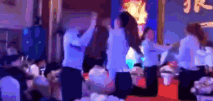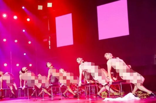 这样的场景,不是发生在某个不入流的洗浴会所,而是某个公司的大型年会,身边还有不少的人围观。