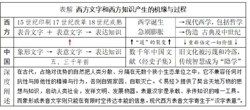 在17世纪晚期以前的西方,其依靠印刷术而兴起的诸文字都是“发音符号”;除此之外,它们所包含的意思均为歧义,而且是排他性的两端:1.宗教文字(希腊文和拉丁文),隔绝人情、人事和人智;2.世俗文字(法文和英文等),隔绝高深、高雅和高尚。因此,17世纪晚期以前西方的诸文字都不适合于书写文学、科学和哲学;也就是说,在此之前的西方不存在“古典、经典”(著作),要有,都是后来伪造或改造的(旧文本都被重写)。