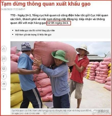据每日经济新闻,2020年3月24日,越南海关宣布从2020年3月24日零点开始,各种大米产品都要被列入禁止以任何形式出口。
