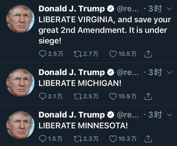 一时间,东西海岸民主党州纷纷自救,绕开共和党联邦政府,“东西互保”。本次美国抗疫期间表现最好的加州自然而然成了领头羊。在全美国都买不到口罩的时候,加州已经规定不戴口罩的人要罚款!正如加州政府所说,他们的口罩供应整个西部都绰绰有余。不光是口罩,加州抄起作业来也有板有眼:早在3月17日加州高风险地区就下达了严格的局部隔离令,居民非必要情况不得出门;两周后,隔离令全州生效,封锁措施级别还高于联邦。加州是美国最早出现疫情的地区,然而截止到4月17日,加州4000万人口中每日新增病例2300余人,比起现在每天3493人的意大利(人口6000万),算是伯仲之间。加州的亮眼表现如同一盏明灯,将特朗普的无能照得清清楚楚。如果说中国的成功还可以用“不民主”搪塞过去,那么加州的缓解怎么解释呢?难道是加州政府集体叛变革命,跑到大街上学习“共产主义封城”啦?特朗普无论如何不能容忍加州的正确,更不允许民主党挟抗疫功绩向他逼宫。17日连发三条推文,用大写字母写道“解放密歇根州。解放明尼苏达州。解放弗吉尼亚州,保有伟大的宪法第二修正案赋予你们的权利(即公民有持枪权)。它正在受到封锁。”这三个州的州长都是民主党人,此举立即引发美国舆论的热议。纽约时报称,特朗普的推文是在怂恿保守的“反隔离示威者”,违反了自己发布的防疫指导意见,他之前一天还表示各州有权根据自身情况决定重新开放的节奏。可惜呀,正确的答案早就在中国的黑板上写着,特朗普一来不愿抄二来也没法抄完全做不到,只能期望走一条美国特色的抗疫道路(说白了就是坑蒙拐骗加甩锅),其结果只能是坑越挖越大。为了打倒特朗普,民主党人现在拼了命也要把抗疫不力的帽子扣在他头上。