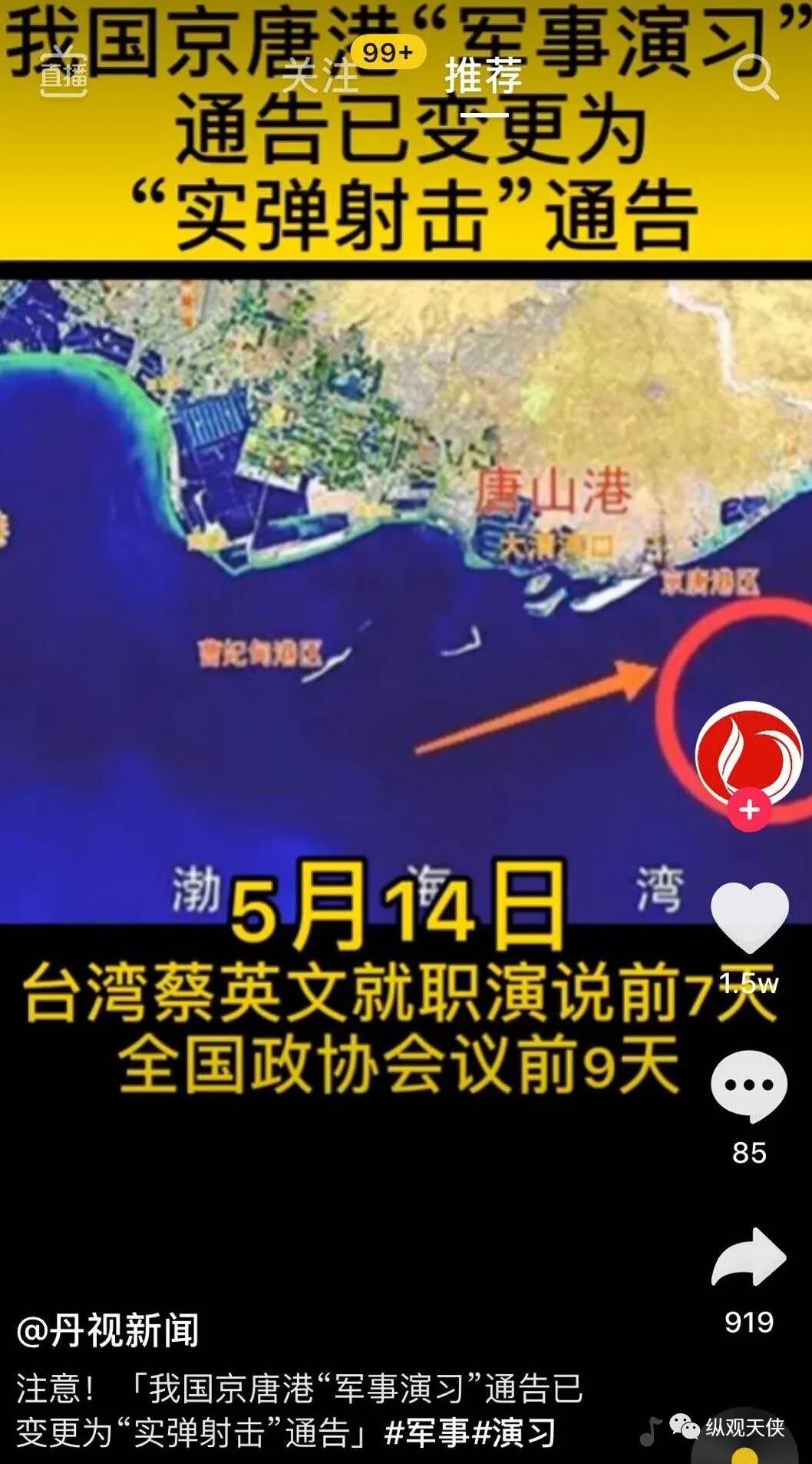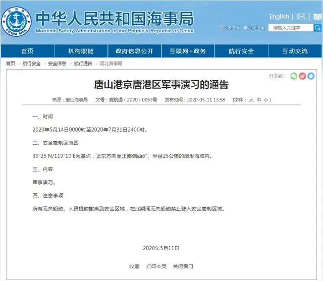 5月11日,中华人民共和国海事局官网发布《唐山港京唐港区军事演习的通告》(文号:冀航通﹝2020﹞0063号)。