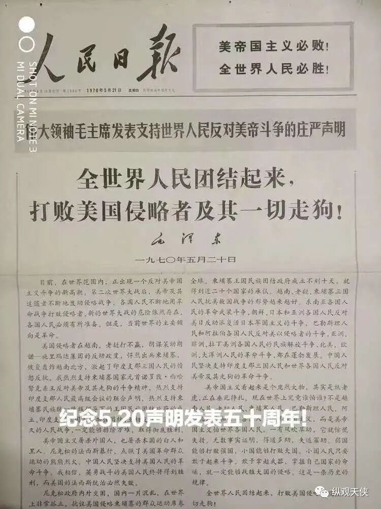 正是在上述背景下,5月20日毛主席发表《全世界人民团结起来,打败美国侵略者及其一切走狗》,简称“五二〇声明”。声明的核心内容有两条: