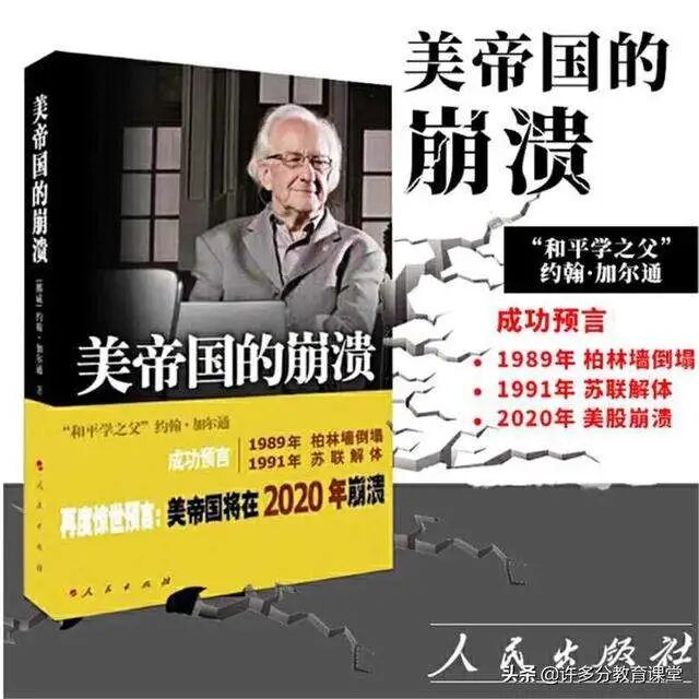 和平之父约翰.加尔通,在准确预言柏林墙倒塌和苏联解体之后,2009年他在《美帝国的崩溃》一书中写到:2000年我曾预言美国在2025年将会崩溃,但现在我将时间缩短了5年。