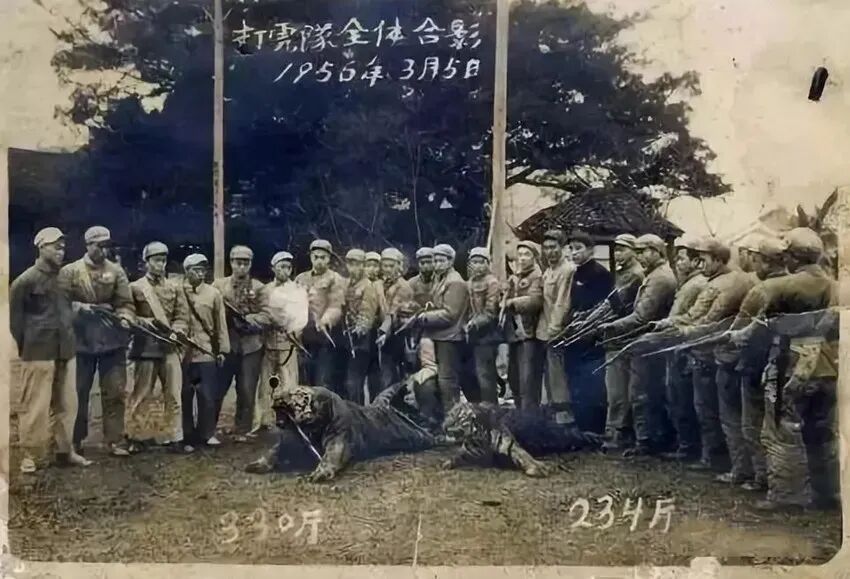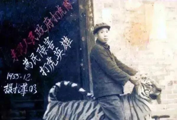 例如当时的野猪、山牛、老虎纷纷跑出来祸害田地庄稼、乃至于“太阳未落去,老虎撞门来”,在当时,政府还专设有持枪民兵守护,但由于村庄众多,难免无法雨露均沾。也就在这一年,饿虎出山了。1952年初,饿虎相继在湖南省份周边村庄到处伤人,当时中南军政委员还发出指令:“招各地森林猎户上山围捕大型伤人动物,凡打死一头野猪奖励谷一斗、打死山牛奖励谷两斗。”而老虎由于比较凶猛,需上报,如果量多,还需要派遣民兵。自1952年起,当地常年受虎群危害,据当地不完全统计,10年间,湖南周边有接近2000余人先后葬身于虎口。其中良田破坏、家畜损失不计其数,而这场虎灾最严重之时,曾一个80人村庄一天之内被老虎吃掉32人,还因此政府调遣众多老兵前去围剿,当场用机枪扫射死两只老虎,一只为330斤,一只为234斤。上面这张照片是1955年12月一名湖南猎户,骑在已经打死的老虎背上,表彰留恋摄影。这个打虎英雄叫陈耆芳。早年的陈耆芳,只是当地一位小有名气的老猎户,并不专门猎虎。但到了1952年,这位64岁的老猎户却拍案而起,发誓从此要专杀猛虎,虎患不除不封刀!这背后,还有一个悲惨的故事。1952年深秋的一天,陈耆芳让年仅14岁的孙子陈青乃,到自家地里挖红薯,但直到天黑,孙子也没有回来。感觉不对,陈家人赶到田头,却只找到一只鞋。从脚印分析,陈耆芳断定孙子遭遇了虎患。孙子遇害,令老猎人愤恨难平,他发誓从此要追杀此虎。陈耆芳连夜调配出一种毒药,在处理完孙子后事后,带着两个儿子出了家门。从这一天开始,陈耆芳父子3人开始了长达3年的丛林追猎。陈耆芳含恨出手,一年猎虎竟达40余只,附近县城的精干猎手先后慕名而来,他的打虎队也由父子3人迅速发展到50多人,猎虎手法也多种多样,有陷阱、弩、猎枪、圈套、炸药等。陈耆芳常将队员分成6组,以耒阳县城为中心纵横深山几百里围猎猛虎。随着名气越来越大,邀请“打虎王”陈耆芳到湖南省其他地方帮忙的人也越来越多。在毛主席的故乡韶山那边,据说有只猛虎重达300公斤,当地没有人能收拾得了它。听说陈耆芳最能打虎,所以政府把他们几个队全部调集到韶山打虎。