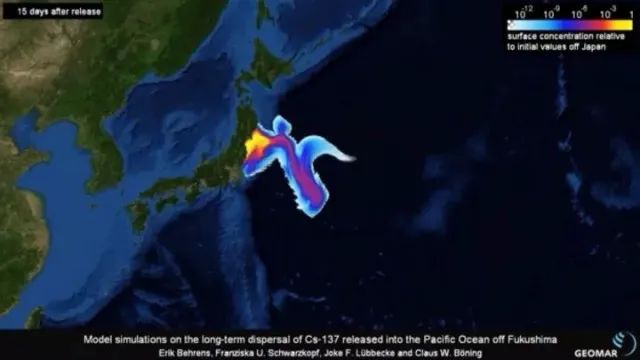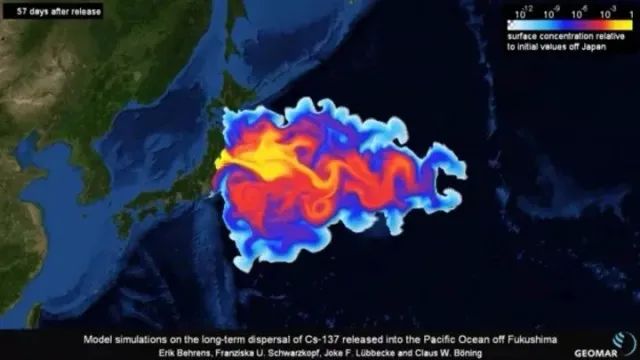 顶级海洋科学研究机构——德国GEOMAR Helmholtz Centre曾对核废水的扩散情形进行计算机模拟演练。蓝色为轻微辐射,红色为高剂量辐射。