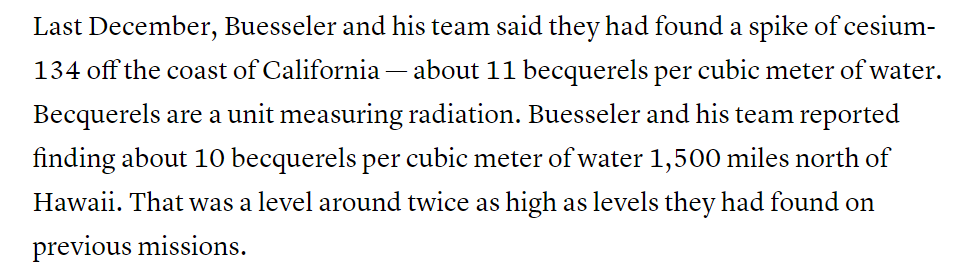 有研究者在加州海岸找到了高含量的铯-134放射元素。还有夏威夷海域,放射物含量的水平已经达到先前的两倍。