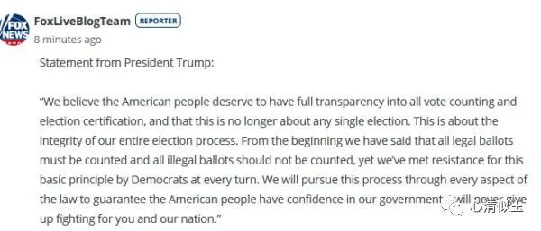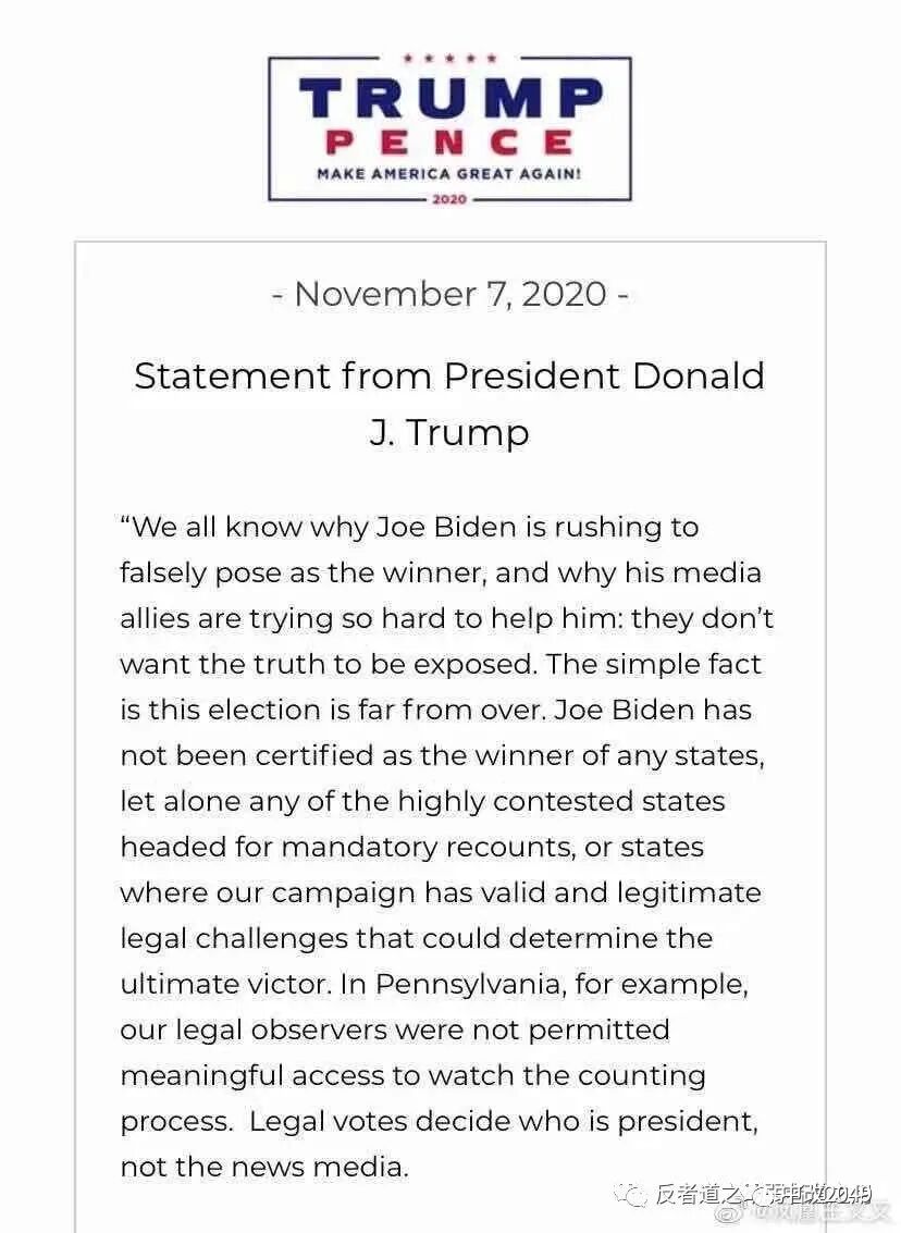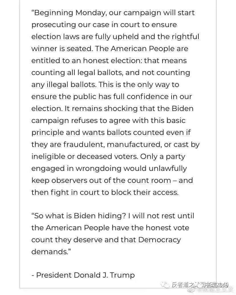 周一开始,我们将提起诉讼来确保选举法被充分履行以产生正确的胜者。美国人民需要一个诚实的选举:统计所有的合法选票,不包括任何不合法的选票。这是唯一的方式来确保公众对我们的选举充满信心。拜登的竞选拒绝同意这些基本的原则并允许统计那些欺诈的、伪造的或来自不合格甚至已经去世了的人的投票。只有那些要做错误的事情的政党才会把观察员隔离在计票间之外,并且要在法院诉讼以支持此行为。