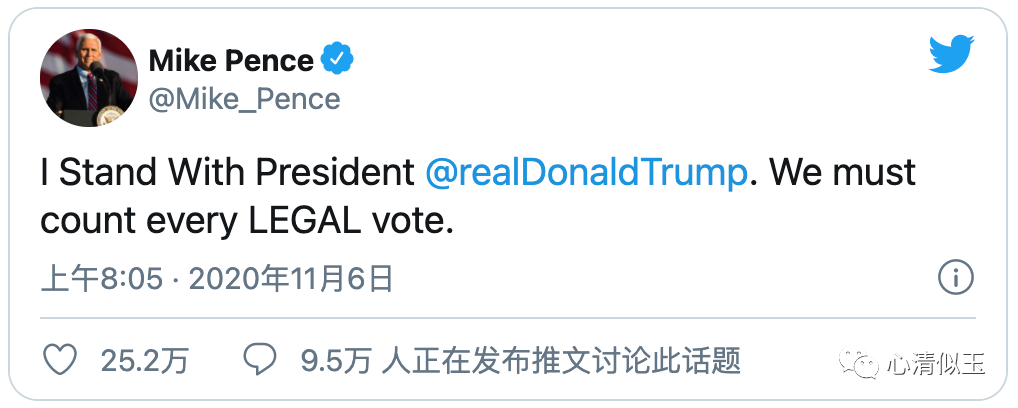 副总统彭斯当天也在推特上说:“我和川普总统站在一起。我们必须统计每一张合法选票。”