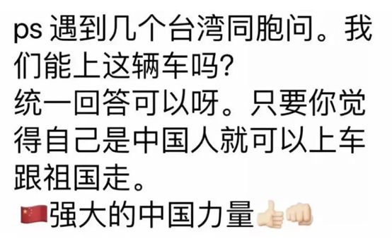 其他国家的人还在排着遥遥无期地长队,等待救援,而中国人先走一步。救援车赶到时,几名中国台湾同胞问,“我们能上这辆车吗?”得到的回答是:“可以啊,只要你觉得是中国人就可以跟祖国走!”![]()