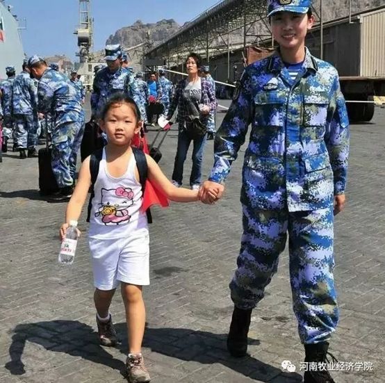 第二张照片,是也门动乱时,中国海军护送一个中国的小女孩离开危险之地,平安回家。![]()