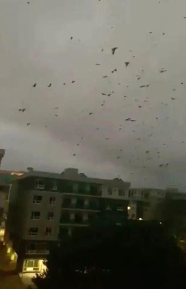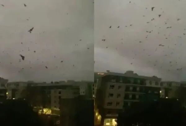 上万只乌鸦在天空中来回盘旋、飞舞,还不断发出刺耳的啼叫声