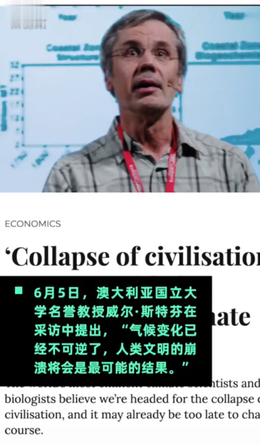 澳洲气候学家威尔·斯特芬指出,"气候变化已经不可逆了,人类文明的崩溃将是最可能的结果。