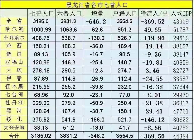 黑龙江十年人口减少了646万,非常惊人。甚至连省会哈尔滨都减少了62万人。