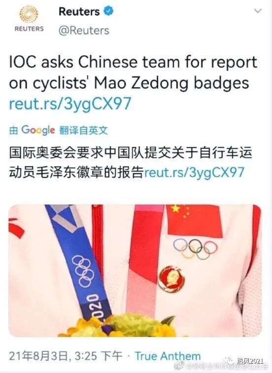 嗅觉灵敏的路透社说,中国运动员佩戴毛泽东像章可能触犯奥运不能在颁奖台作政治表态的规定。