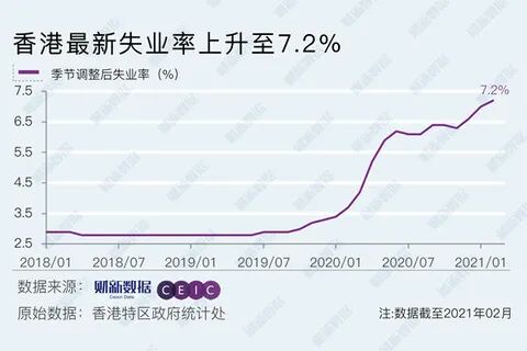 香港就业市场持续恶化,最新失业率升至7.2%,创17年新高;失业人数增至26.16万人。图片来自财新数据