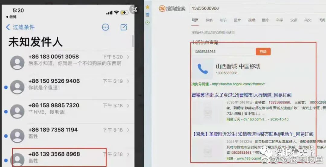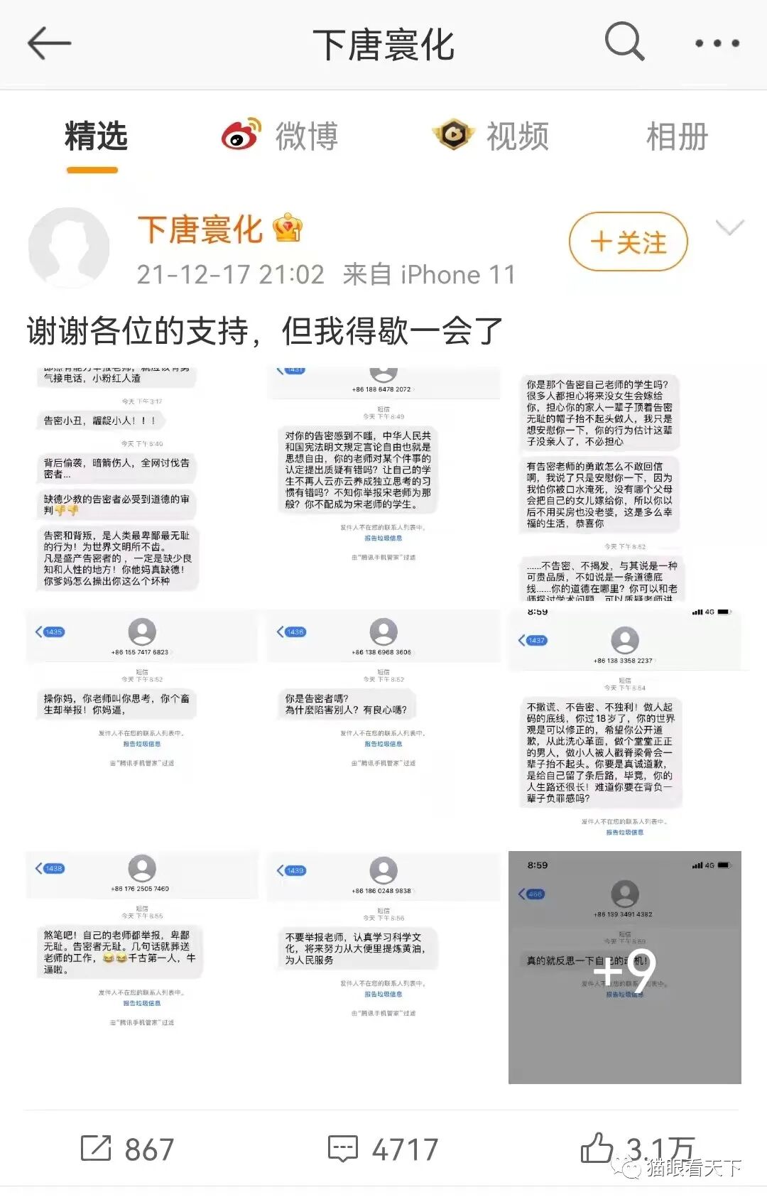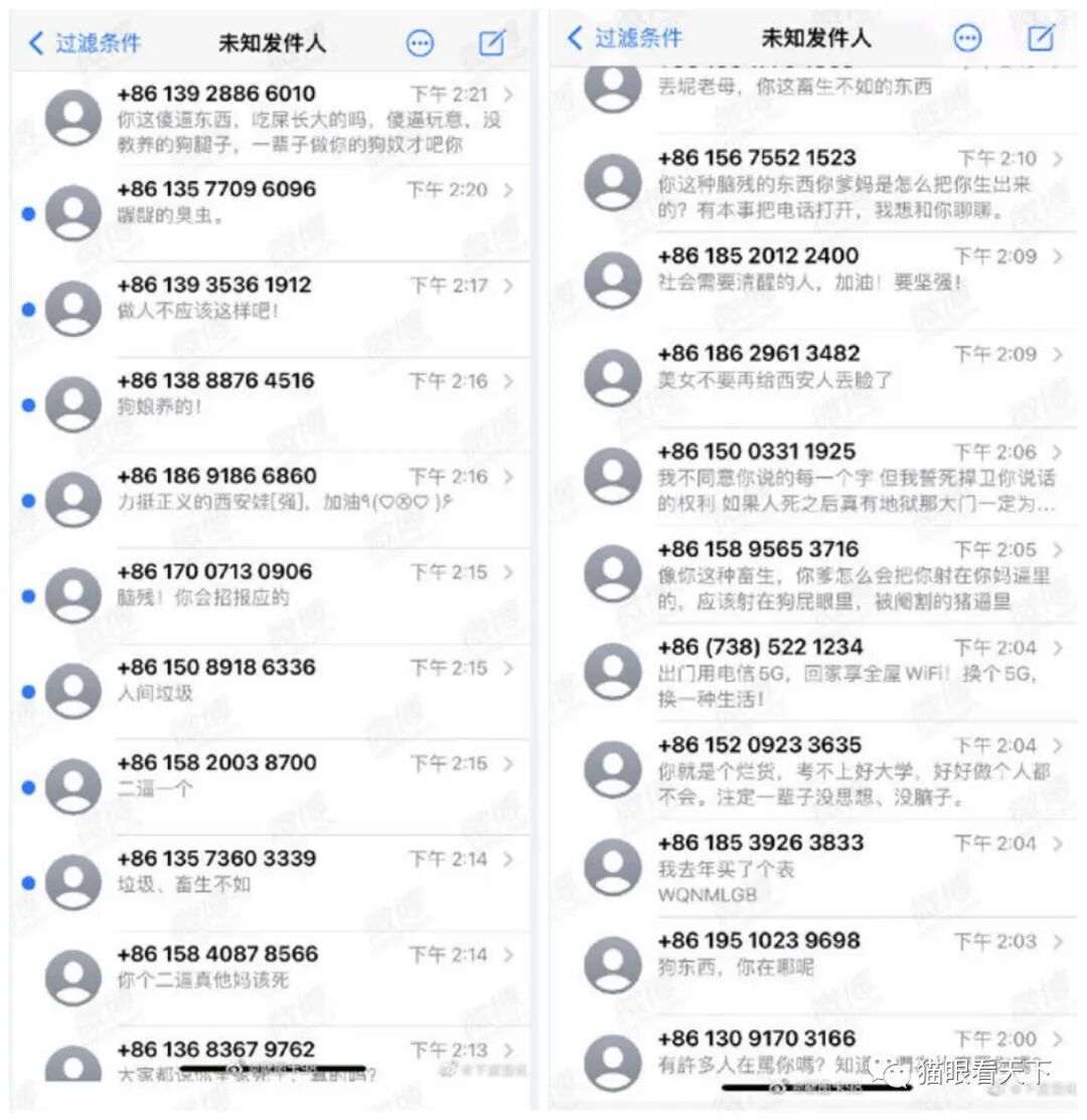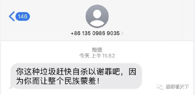 再来看看通过短信进行人身攻击的,这是被攻击的学生通过微博发布的截图。