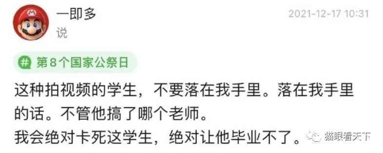 否认南京大屠杀死难者人数并称“不应当永远去恨,而应当反思战争是怎么来的?”这段视频被课堂上的一位学生拍摄并发布上网后,立刻引发全网关注。随后,其所在学校迫于强大的舆论压力,发布了将该教师开除的处理决定。