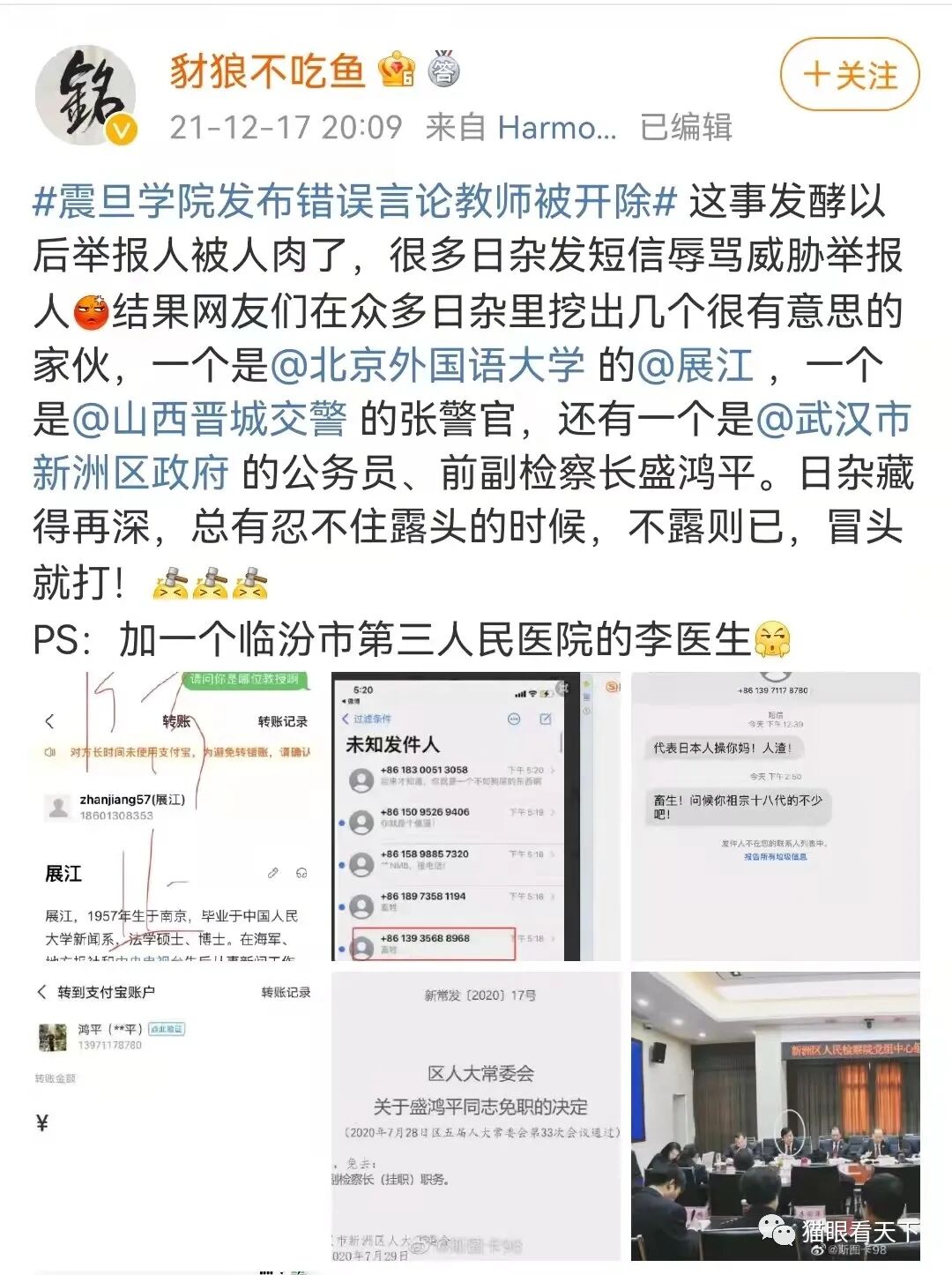 为日杂站台洗地,甚至以这种网络暴力对一个敢于讲真话的同学进行百般人身攻击,这种行为已经明显违法。希望相关部门能重视并积极开展调查,并将调查和处理情况尽快公布。如今震旦事件,再次提醒我们,只要反华势力不死心,意识形态斗争将会一直持续下去,但我们有理由始终相信:邪不压正!