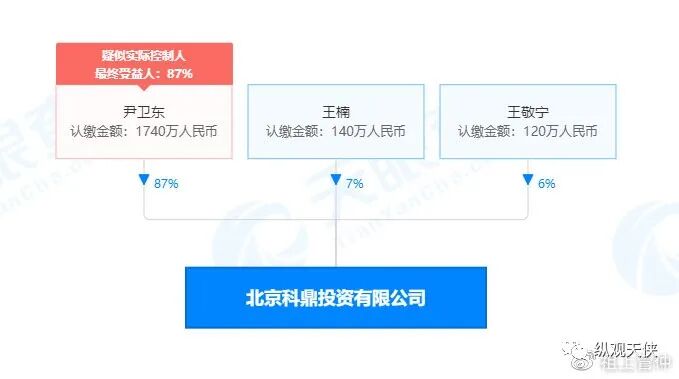 (2)科鼎投资(香港)有限公司,背后的股东在“天眼查”中并未找到,控股股东应该是“北京科鼎投资有限公司”,而“北京科鼎投资有限公司”的实际控制人就是“尹卫东”,另外两大自然人股东是:王楠(股权占比7%)、王敬宁(股权占比6%)