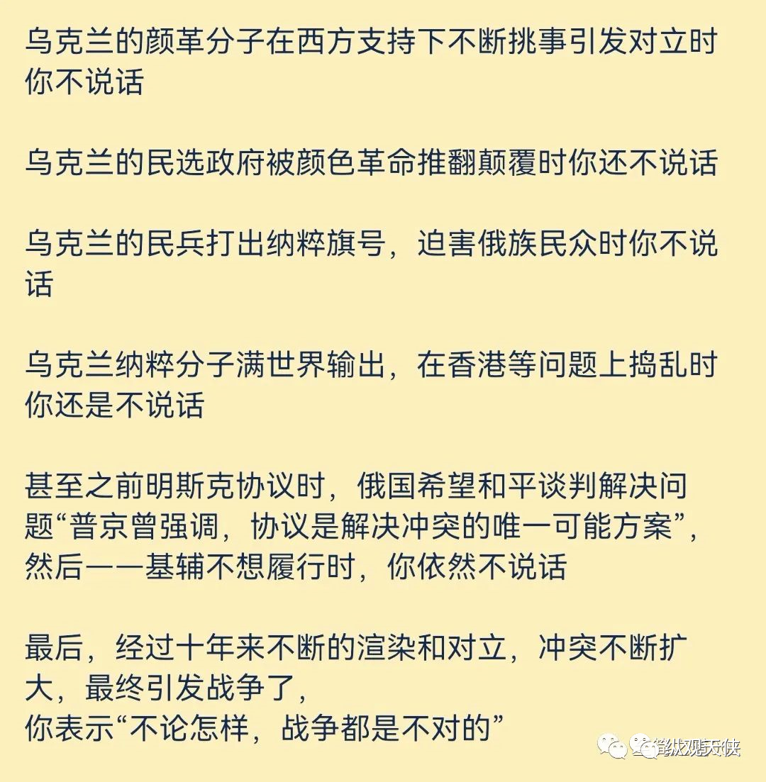 【导 语】我们不支持战争,也不支持在战争话题中搅浑水的人。俄乌两国打起来了,中文互联网上凭空多出了很多“反战反俄”的公知文,在疯狂攻击俄罗斯的基础上大煽“与乌克兰共情”戏,甚至借机贬低中国人,却不道这乱局背后的始作俑者。对此,我们评论是——反战不反美,心里都有鬼。