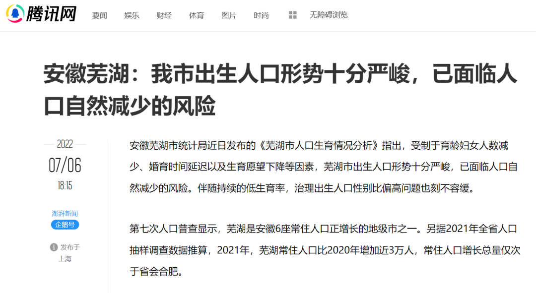 人口学认为,要达到正常的人口更替水平,保持人口简单再生产即上下两代人口的基本平稳,总和生育率至少要达到2.1。国际上通常认为总和生育率1.5左右是一条“高度敏感警戒线”,一旦降至1.5以下,就有跌入“低生育率陷阱”的可能。分析提到,2020年,芜湖市总和生育率仅为 1.11,即一个育龄妇女一生之中平均只生育一个子女,已经远远低于 2.1的代际更替水平,并低于同期全国平均水平(1.3),显然已经跌入国际公认的“低生育陷阱”。