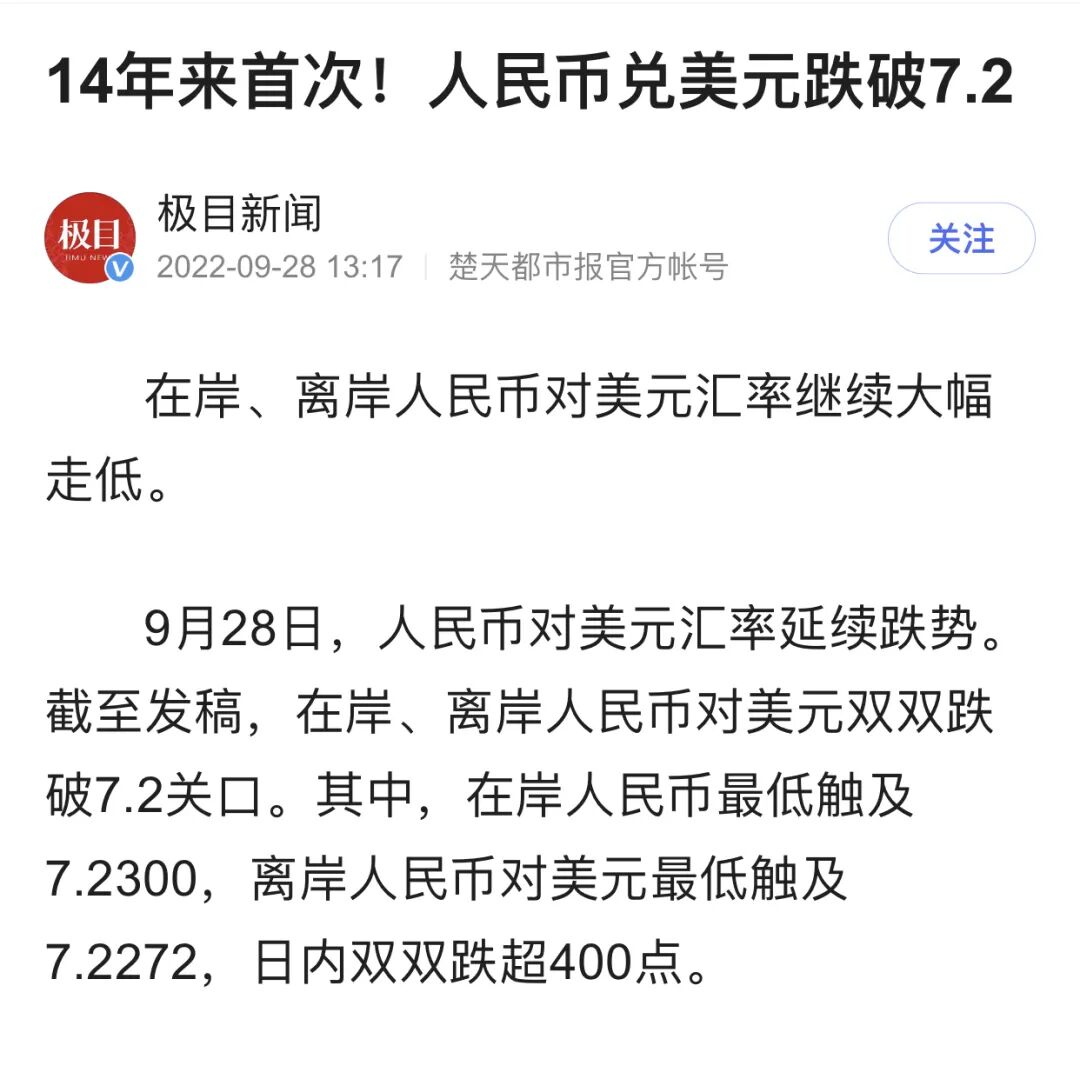 在岸市场同样疲软。9月28日9时30分,人民币即期汇率开盘报7.18,随即跌破7.20关口,较前日下跌超过400个基点,Wind数据显示,这是2008年2月以来首次跌破这一关口。