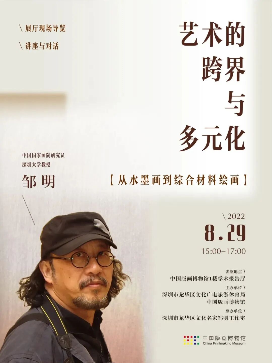 本场活动分为两部分,展厅现场导览、讲座与对话。讲座的主讲嘉宾是中国国家画院研究院邹明,他结合自己的艺术创作实践,从水墨画到综合材料绘画,提出与之相关的一些问题和观点,并联系个人展览涅槃重生中的作品与大家进行交流。